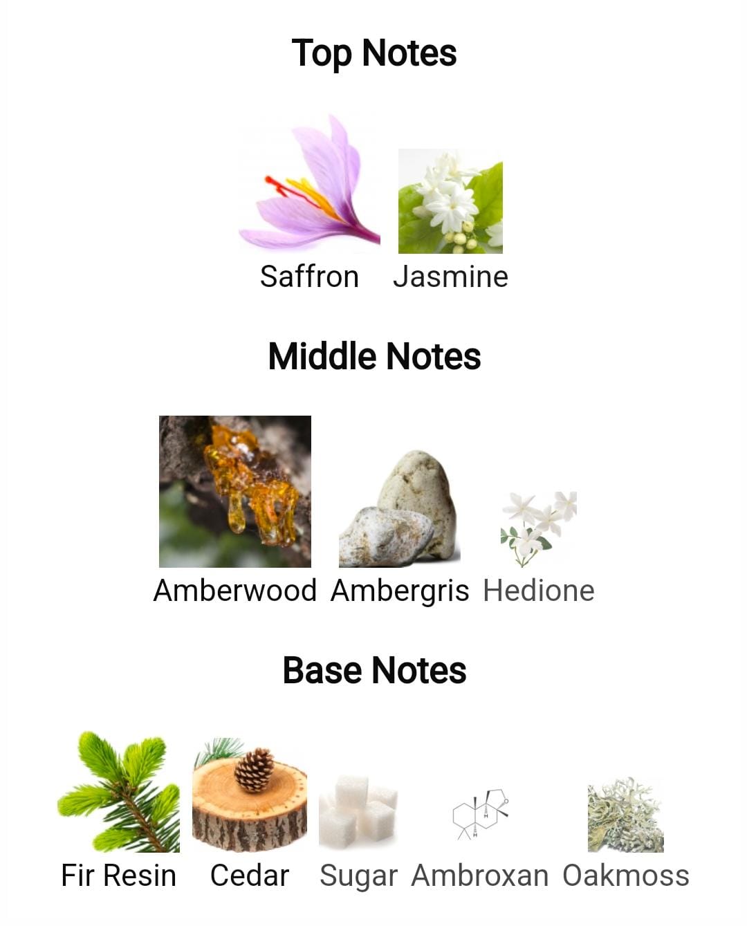 This enchanting fragrance opens with a captivating blend of luxurious Saffron and delicate Jasmine, evoking a sense of exotic allure and floral sophistication. As the scent unfolds, the middle notes of rich Amberwood, sensual Ambergris, and airy Hedione add warmth and depth, creating a harmonious balance of texture and nuance. The perfume settles into a lasting finish with the earthy freshness of Fir Resin, the woody warmth of Cedar, the sweetness of Sugar, the ambery depth of Ambroxan, and the grounding touch of Oakmoss, leaving a memorable and sensual trail.
